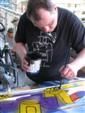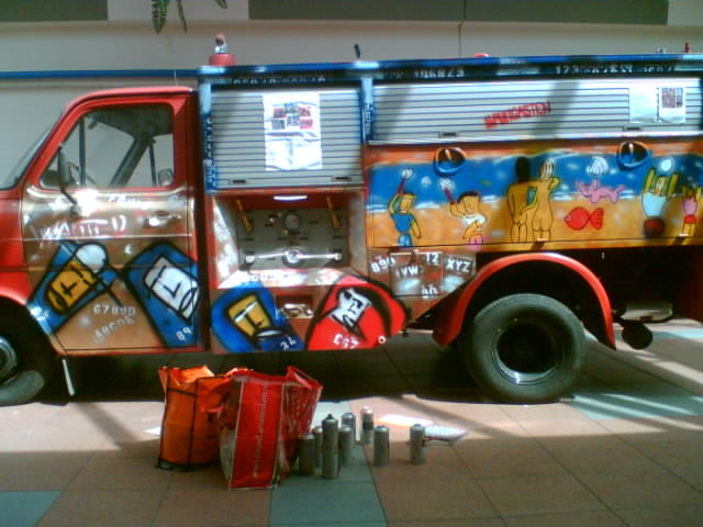 Het beschilderen van de brandweerauto, beschikbaar gesteld door de brandweermuseum, wordt vandaag live beschilderd door Henk Veen in het teken van de sponsering van het Diereneiland. Vanaf 12 uur zal de kunstschilder verder gaan met zijn werk onder begeleiding van de Streetcapoeira groep met live Braziliaanse muziek en dans. Filmpje live schildering museum exemplaar uit 1957. Hieronder foto's tijdens het live schilderen: |
