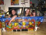| Beschilderde MiniCooper weer geveild In 2003 is Henk Veen gevraagd om een Mini Cooper als kunstwerk om te toveren met als thema Flower Power, voor de Quality of Life gala. Met onder andere Hellen van der Valk en Erik de Zwart. Destijds is deze auto voor 10.000 euro geveild voor het goede doel. Nu vinden wij ons pareltje weer voor een veiling te koop aangeboden bij Deelland. Gewoon leuk om hem weer terug te zien en dat dit keigoeie karretje nog steeds triomfantelijk op de weg rijdt. Bekijk ook het filmpje hier op You Tube. |